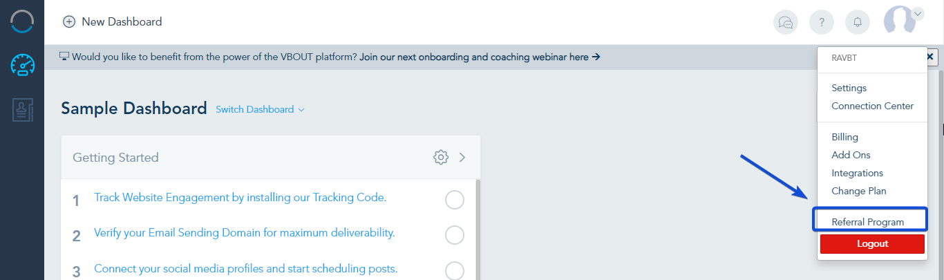 Once, you sign up to your referral account, you will be redirected to your dashboard. To access the Referral program, open the menu next to your profile and go to Referral Program.