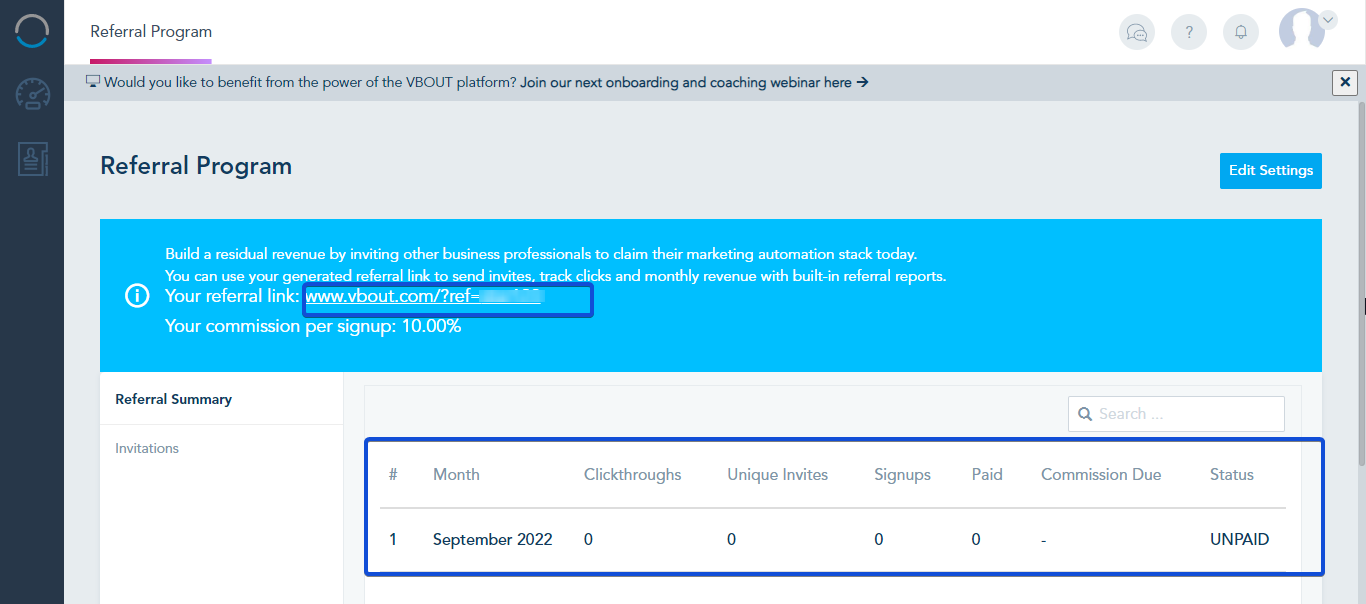 You will have a breakdown of all the clickthroughs that came from the link you’ve shared, the unique invites you’ve sent, the conversion signup from those clicks, as well as the commission due for that month. The status indicates if the commission was PAID or still UNPAID.