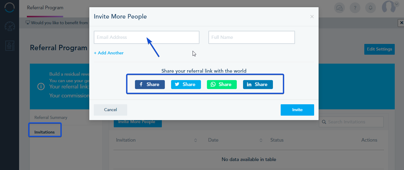 Also, you have the option to send Invitations to specific Email addresses or over your Social Media profile. Go to Invitation, specify the email address to share this link or share over social media.