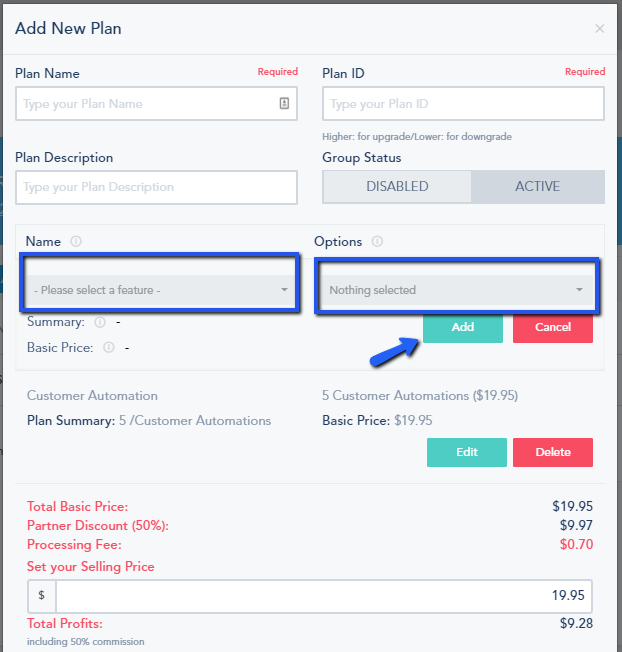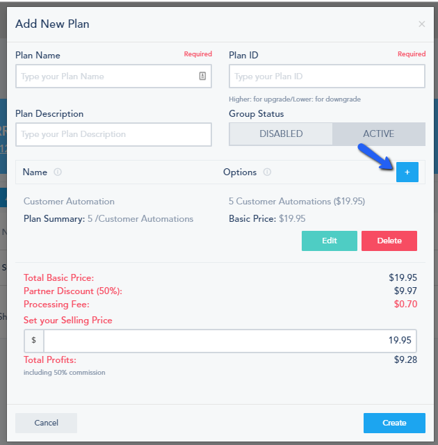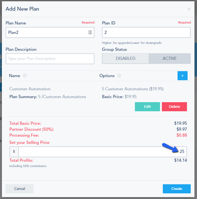 - Plan Description: Give your plan a description, for example: This plan includes Customer Automation and Email Marketing. (Note that Plan Description is not required)