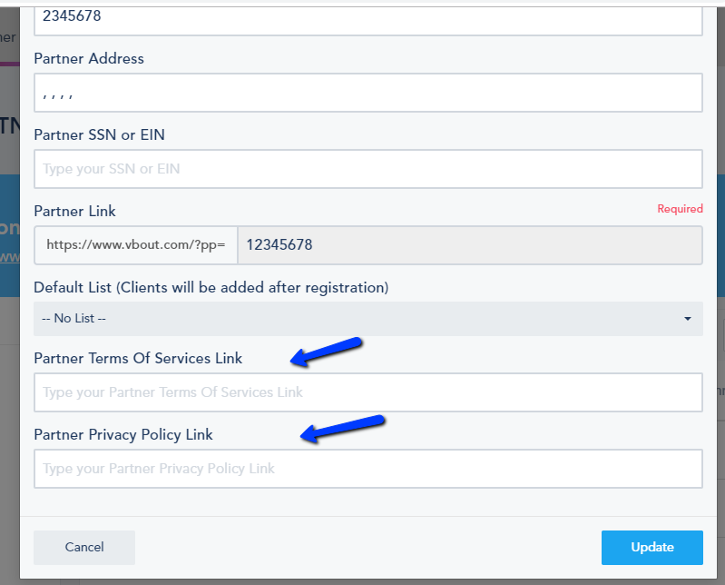 Note: If you don't add links to Terms of Services and Privacy Policy, they will redirect to the platform.