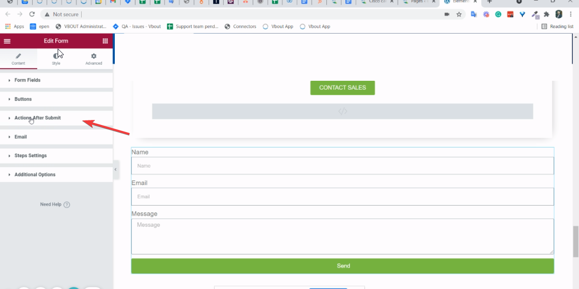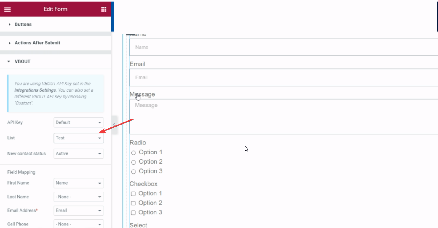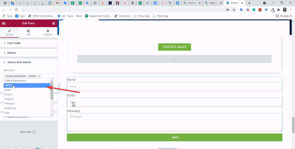 After creating your form in Elementor, in the Action After Submit, choose VBOUT: