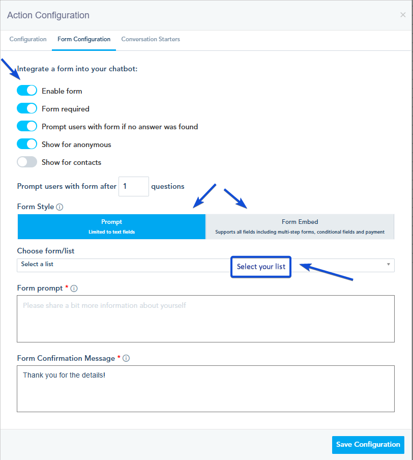 By enabling this option, you can add multiple conversation starters for the user to begin asking the bot.