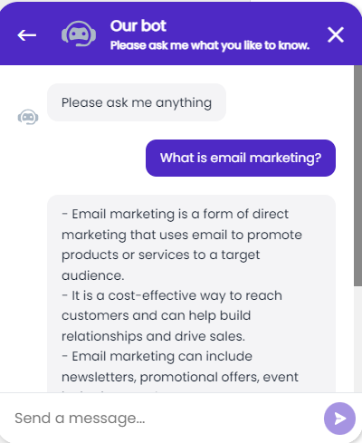Once published, your chatbot will be displayed as shown below. Users can click on any of the conversation starters to begin their chat with that question.