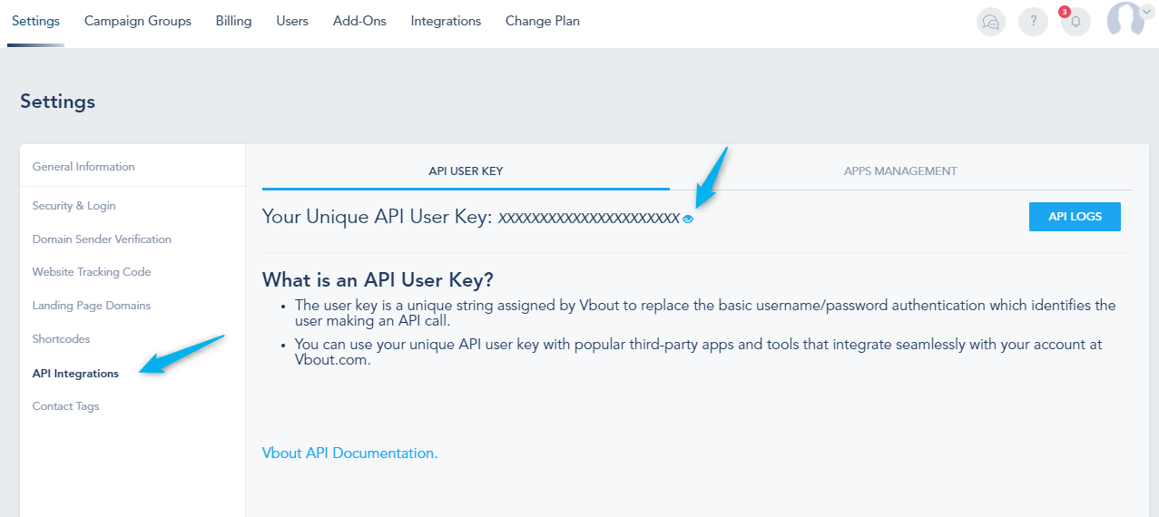 Go to the Integrations tab and fill out the plugin details. You can get access to your API key from the VBOUT API page: