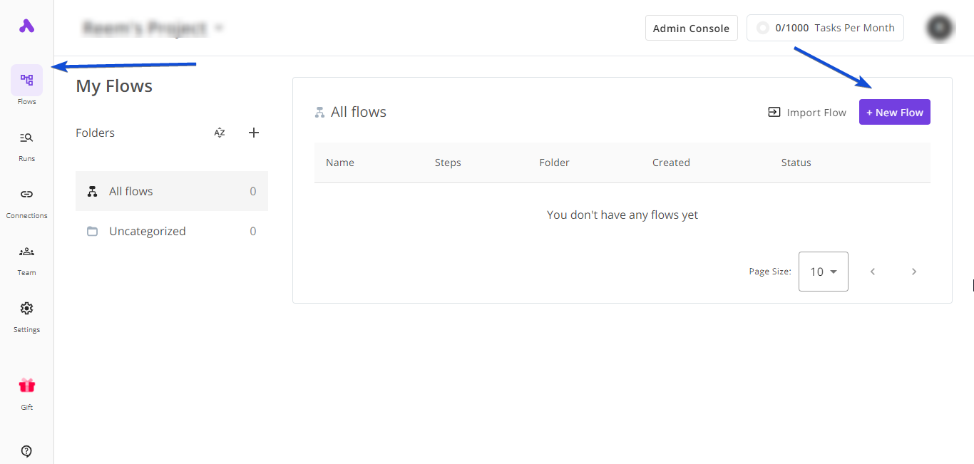 - Once logged in, locate and click on the "Flows" page in the navigation menu.