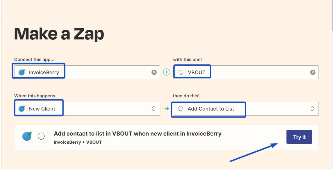 In Zapier, start creating your Zap by choosing to connect InvoiceBerry to VBOUT.