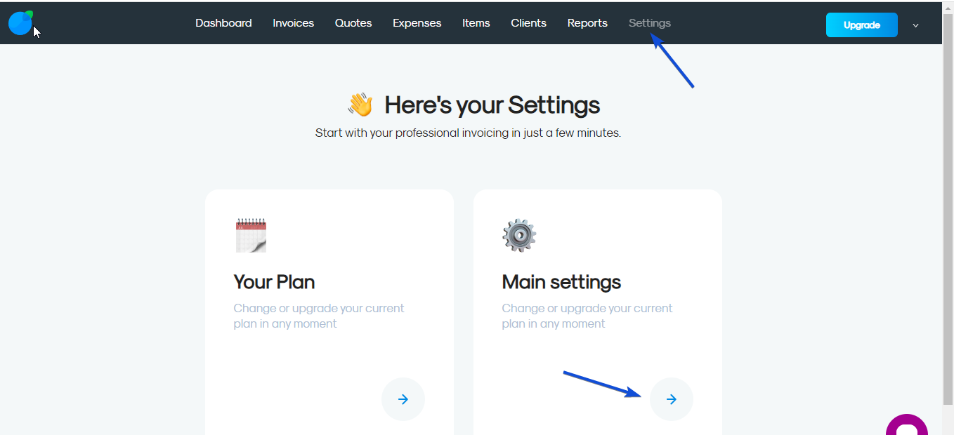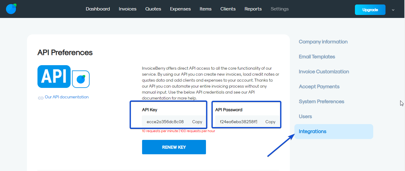 You can find your API key and Password in InvoiceBerry by going to Settings -> Main settings.