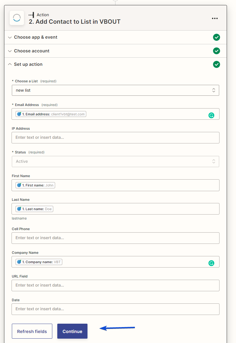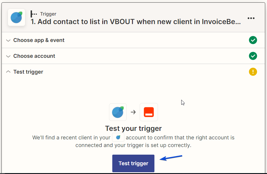 As a trigger, you can choose when a New Client is added in InvoiceBerry, to Add this Contact to a List in VBOUT.