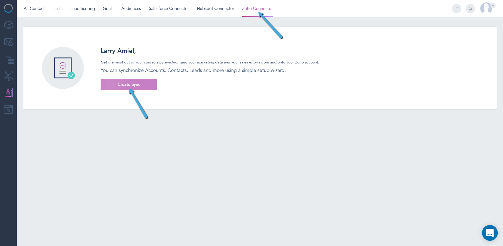 You can access the integration tab from under the Contacts > Zoho Connector (Add-on must be installed or part of your plan)