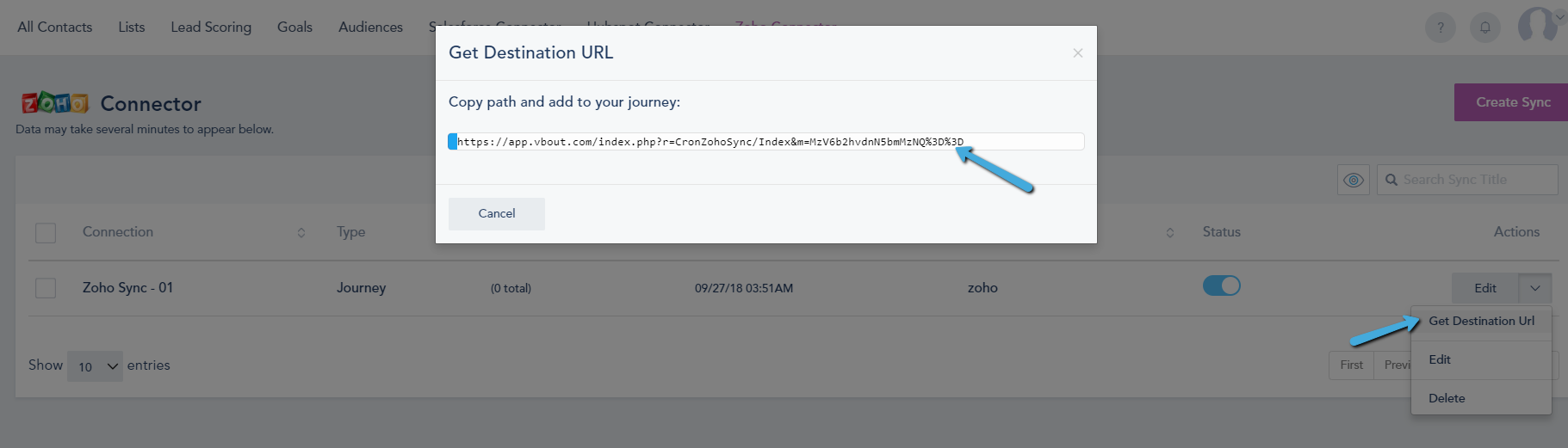 Get Destination URL (if you're using the Automation sync) by going to your List of Zoho Syncs select the drop-down and click on the "Get Destination URL" option.