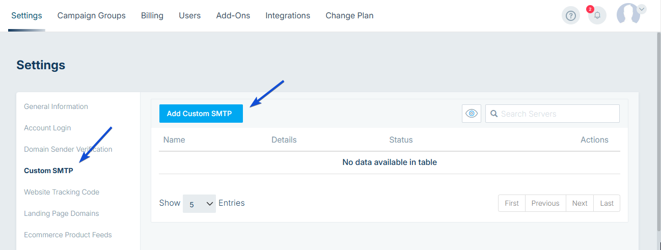 Custom SMTP allows you to use your own SMTP while sending from the platform, using your own IP pools.