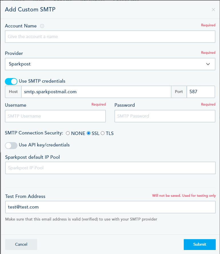 For Sparkpost or Sendgrid, you are able to either use the SMTP credentials or the API key/credentials:
