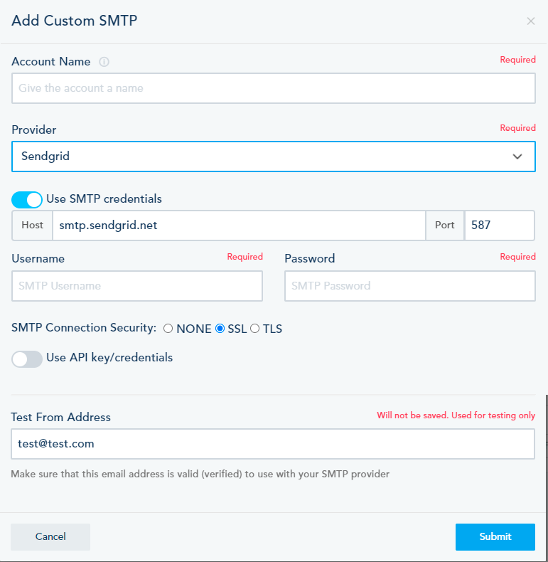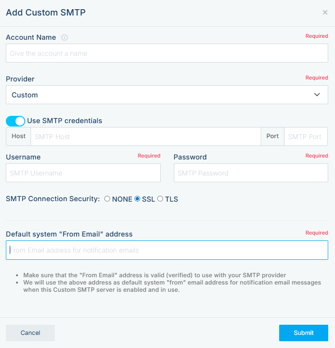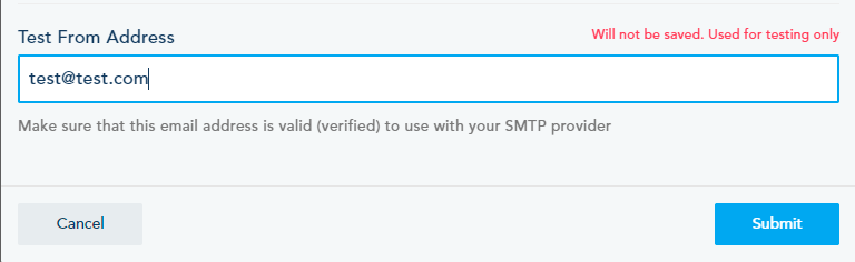 NOTE: Make sure that the email address is valid (verified) to use with your SMTP provider, otherwise you won't be able to add the Custom SMTP and will face an error: