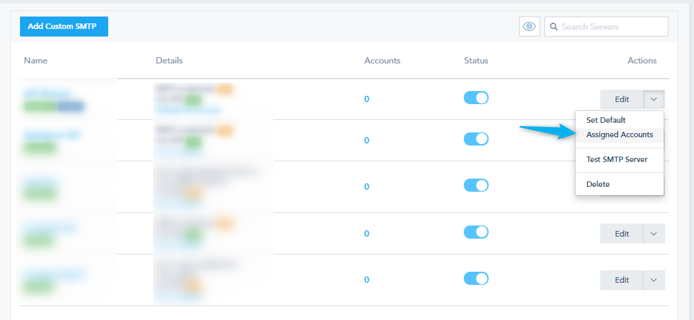 To assign accounts for a custom SMTP, click on Assigned Accounts, or you can click on the number in blue under Accounts: