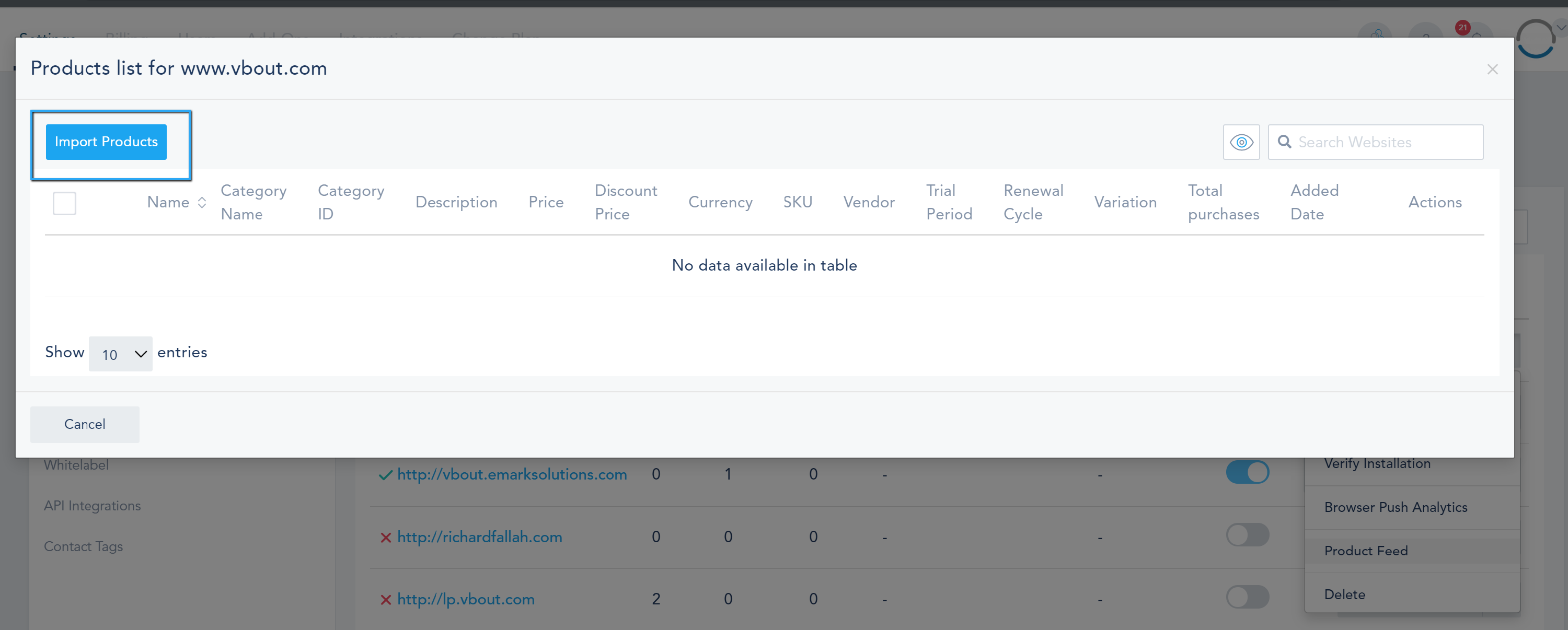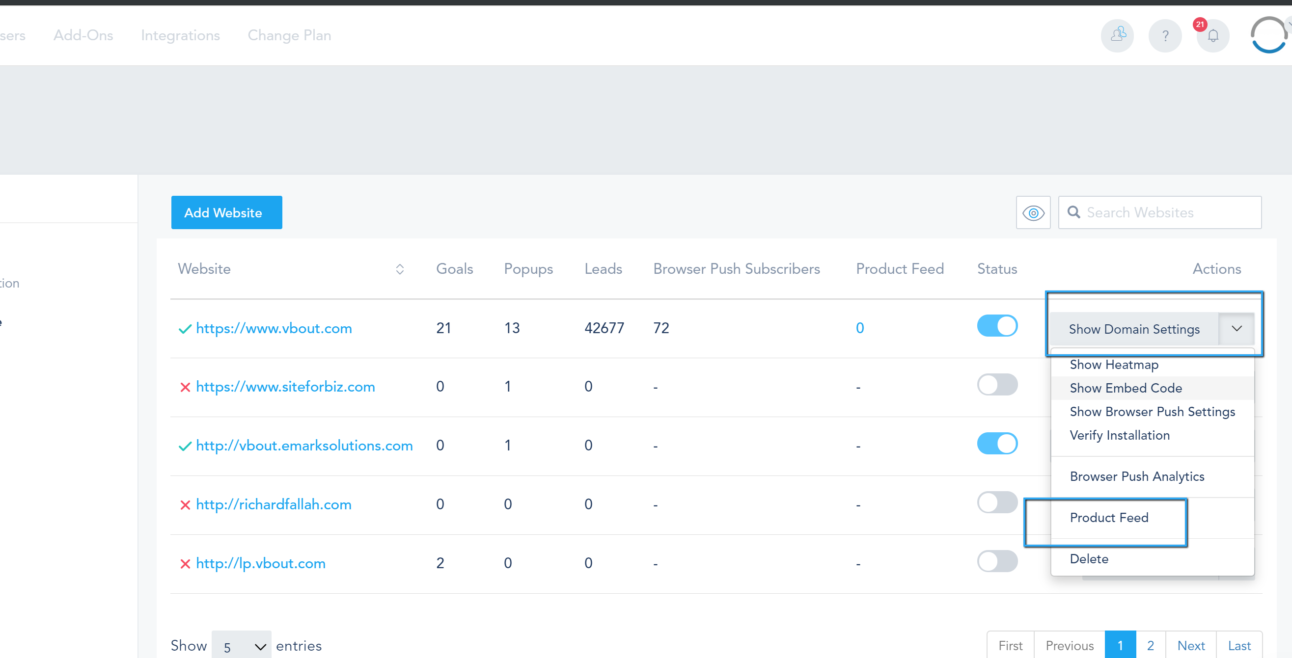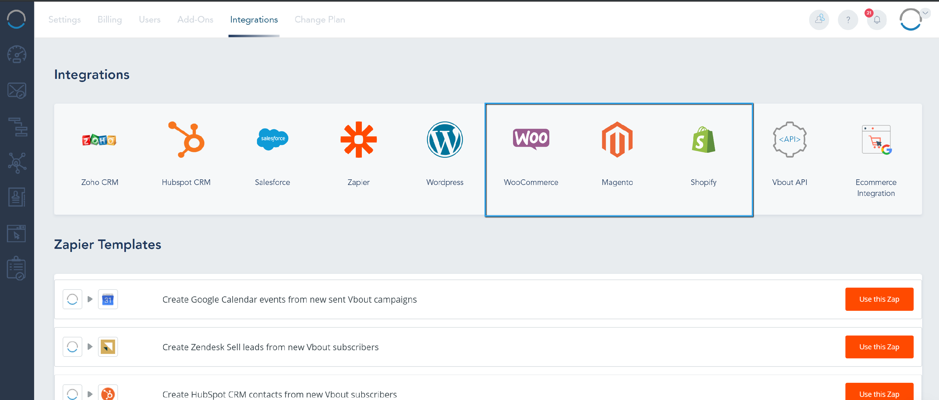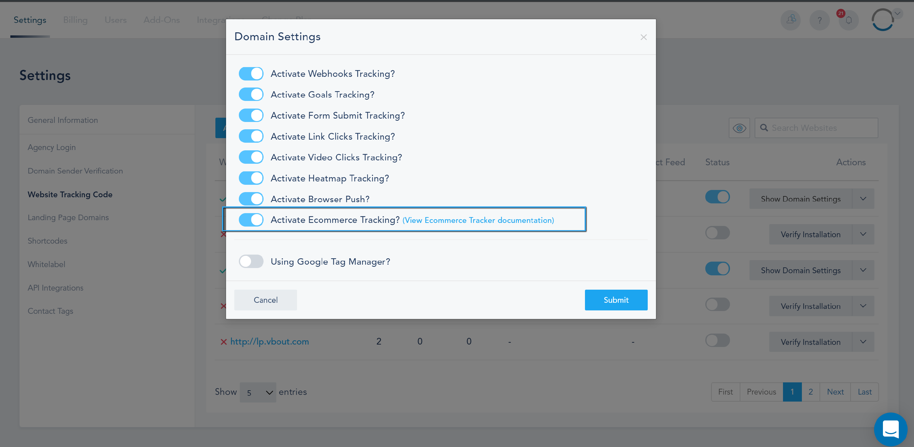 Automated E-commerce has many benefits such as increasing sales, loyalty and customer retention, and LTV (life time value). There are several advantages when choosing to integrate your E-commerce website with VBOUT, using the shared data, you will be able to send your customers post-purchase offers, suggested products, cart abandonment reminders, loyalty campaigns, referral requests and much more as well as using the data for internal processing such as notifying a team member of a purchase. To integrate your e-commerce website with VBOUT, go to Settings, Website Tracking Code, click on Show Domain Settings and toggle Activate Ecommerce Tracking on: