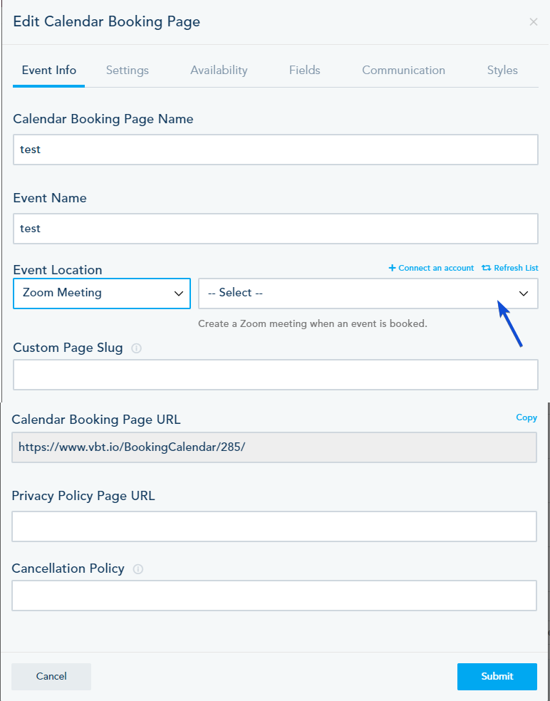 Event Info: you can change the booking page name, add a name and location to your event, add a Privacy policy page, and choose your cancellation policy. You can also choose to link it to your Zoom account.