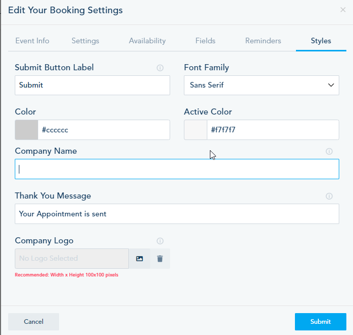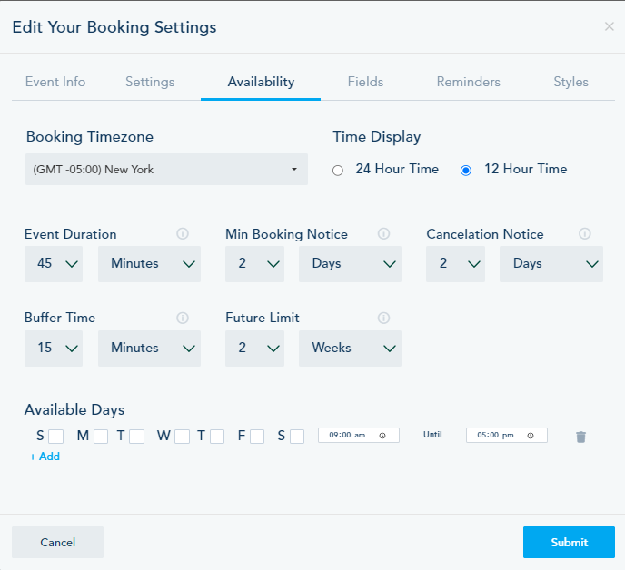 Availability: Choose the event time zone and the available date and time, and set the event duration, Min Booking Notice, Max Cancelation Notice, the buffer time between events, and the future limit to book.