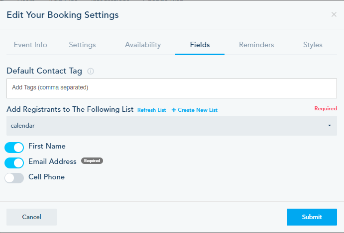 Fields: Choose the list to add your registrants and the fields you need them to fill. Also, you can add a default tag to your registrants.