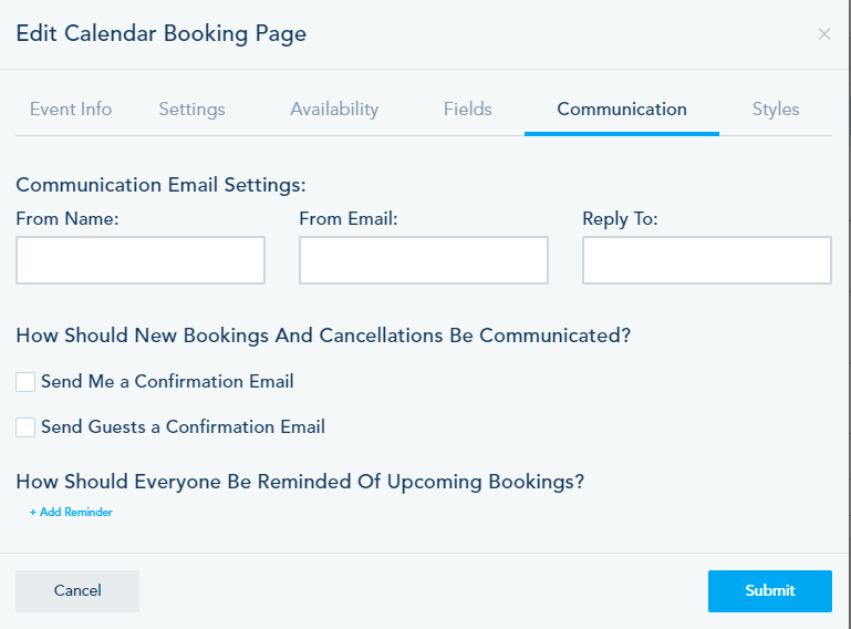 Reminders: Choose to send a confirmation email and how to remind guests about upcoming bookings.