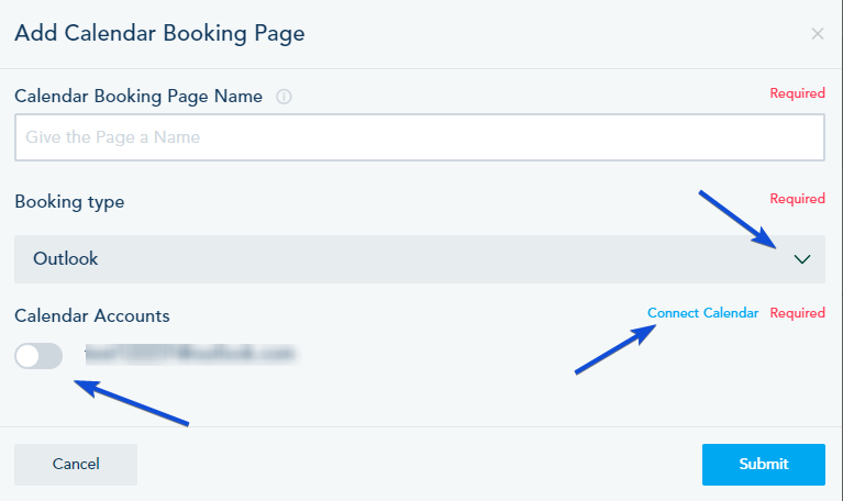 To create your Calendar Booking Page, choose Outlook as the booking type, and a calendar account if you have already connected your Outlook account or you can click Connect Calendar and connect the calendar: