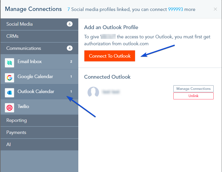 To connect the calendar, go to Connection Center -> Outlook Calendar and connect your Outlook Calendar.