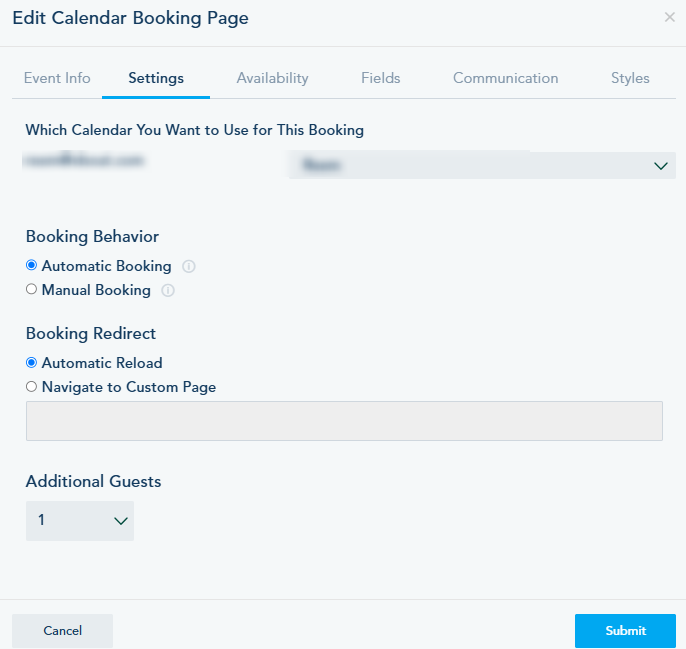 Settings: Choose the calendar you want to use, if the booking should be automatic or manual, and the redirection behavior.