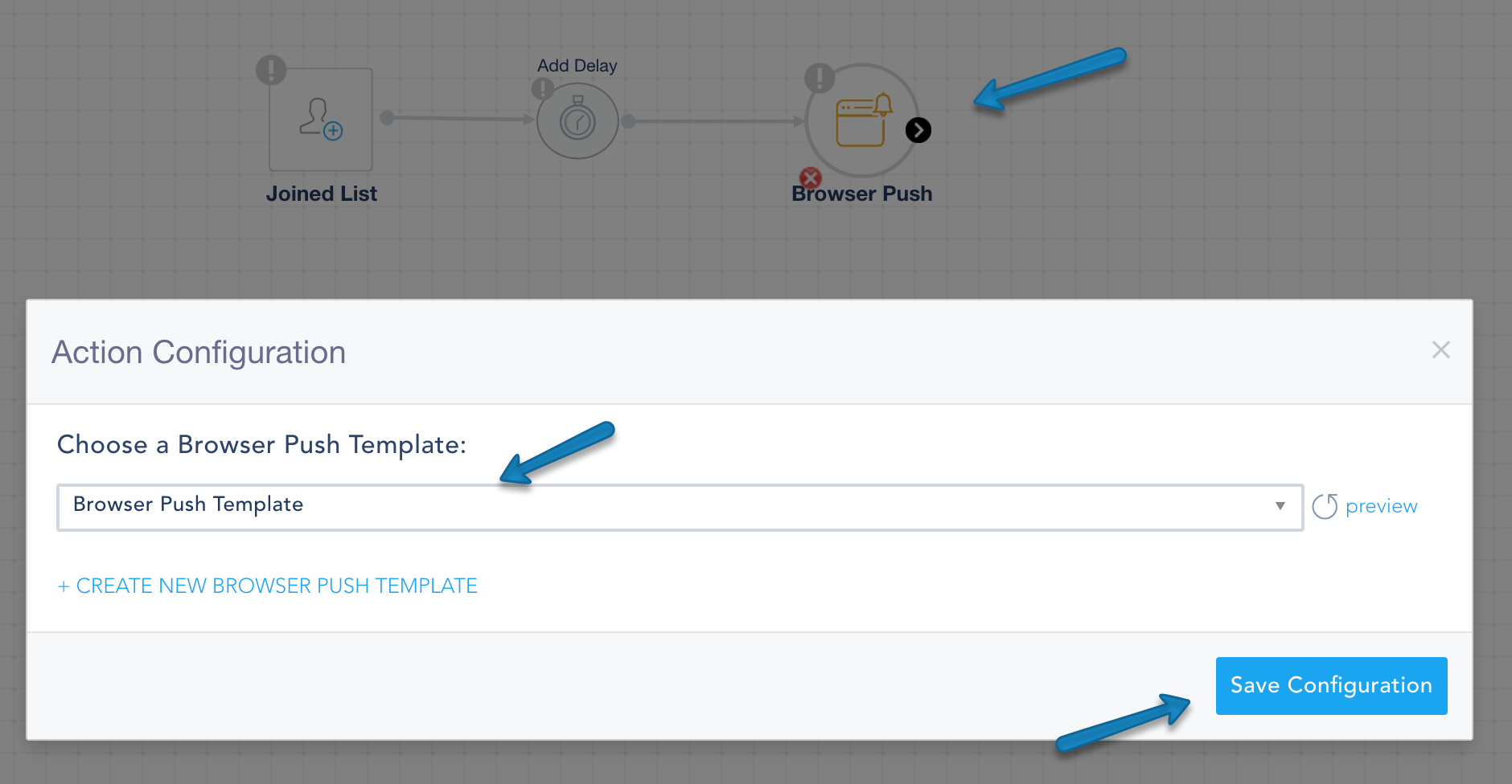 As an example, we will use Joined List Action, a Delay and Browser Push. Choose a List, put any Delay and double click on the Browser Push to choose the template we've created earlier and click on Save Configuration.