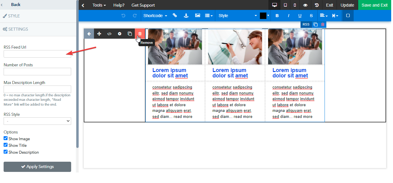 Inside the block settings, you can input the RSS feed URL and customize the number and the style of the posts then click Apply Settings.