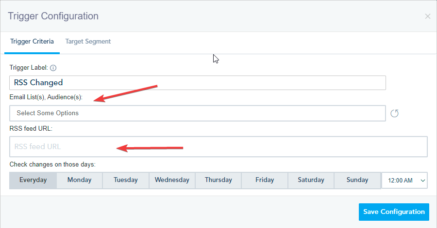 Double click on the trigger, enter a name for the trigger, specify your target specific list(s) or audience(s) and insert your RSS feed URL. Also, you can choose a specific day and time to check the RSS feed update.