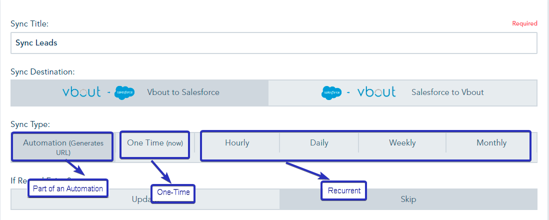 The sync is bi-directional and can be customized as a one-time, recurrent or part of an Automation at the contact level: