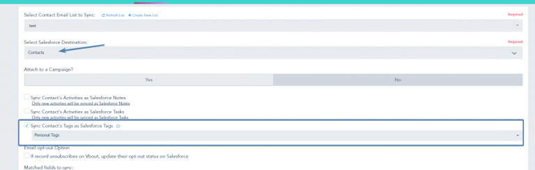 Afterward, Select Contact Email List to Sync and Salesforce Destination; you can now choose to Sync contact’s tags to Salesforce by clicking the checkbox:
