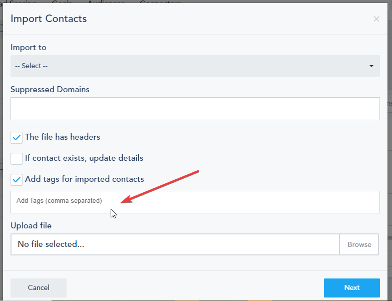 If you want to add the same tags to all the list contacts, select Add tags for imported contacts and add the desired tags separated by a comma.