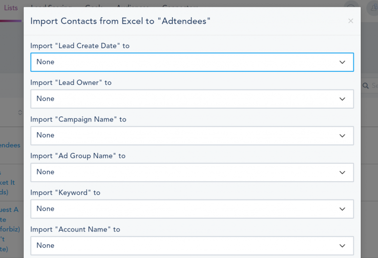 2 - Proceed to the next step where you can map the Excel file columns (Excel column names will appear above each field) to the corresponding fields you have created on your account under those list settings.