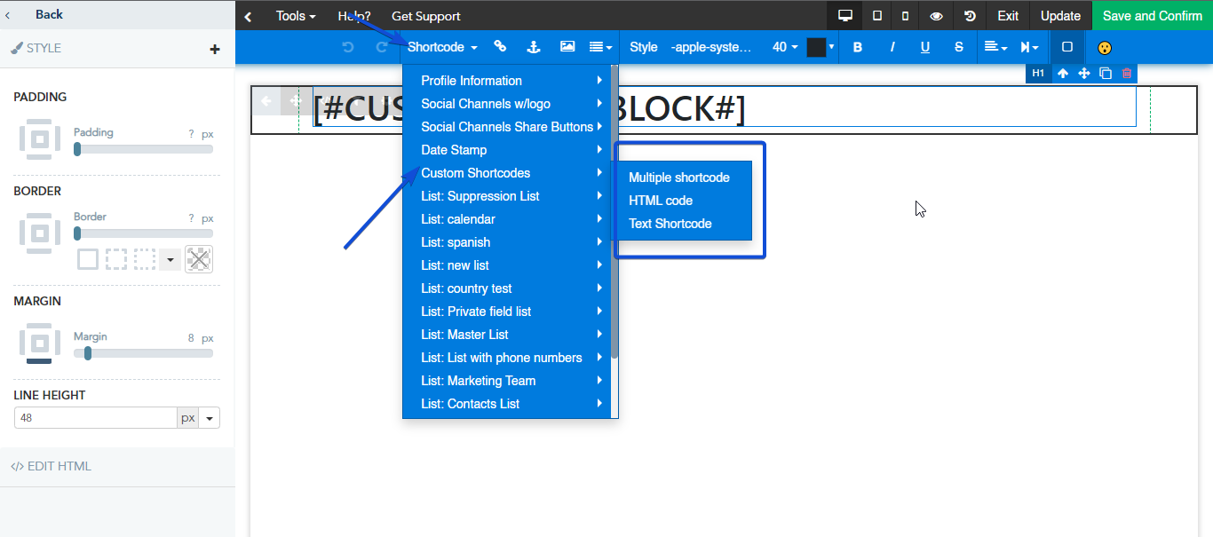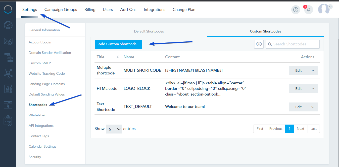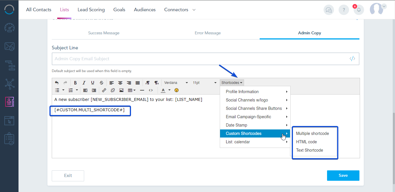 Once created, you can use the custom Shortcodes in your landing page, email, SMS, Browser Push message, and list settings.