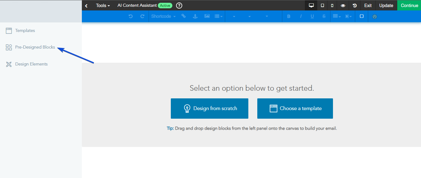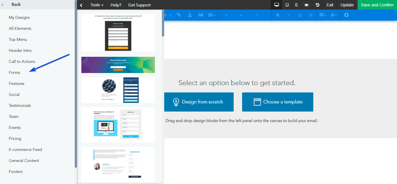When creating a landing page, to add a form, go to Pre-designed blocks: