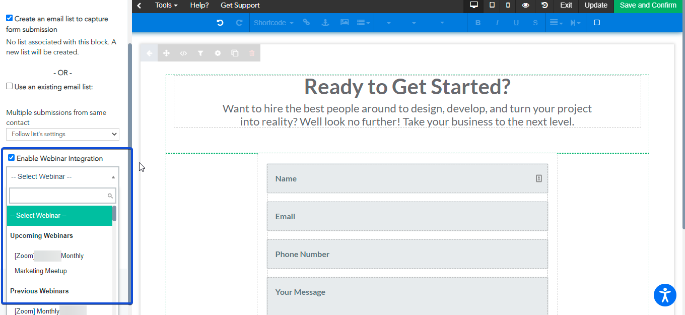 You can connect your landing pages with Zoom or GoToWebinar and use native forms to capture registrations. This gives you the ability to design a fully branded landing page to drive opt-ins, versus using the limited registration pages provided by Zoom and GoToWebinar. It also helps you retain the history of the lead prior to the signup, which is often lost when using external forms.