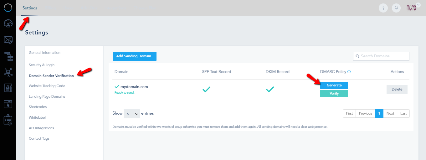 To check and create a DMARC policy, go to Settings > Domain Sender Verification, add your Sending Domain and click on Generate:
