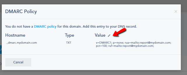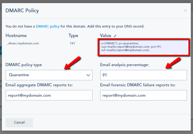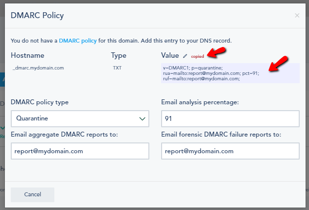 The changes that you make to "DMARC policy type", "Email analysis percentage", "Email aggregate DMARC reports to", and "Email forensic DMARC failure reports to" will be reflected in the Value: