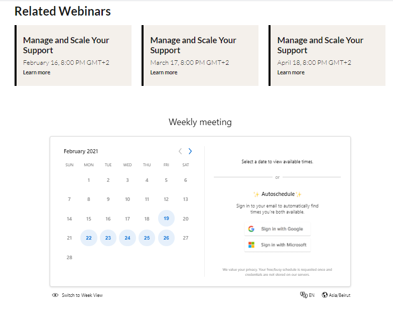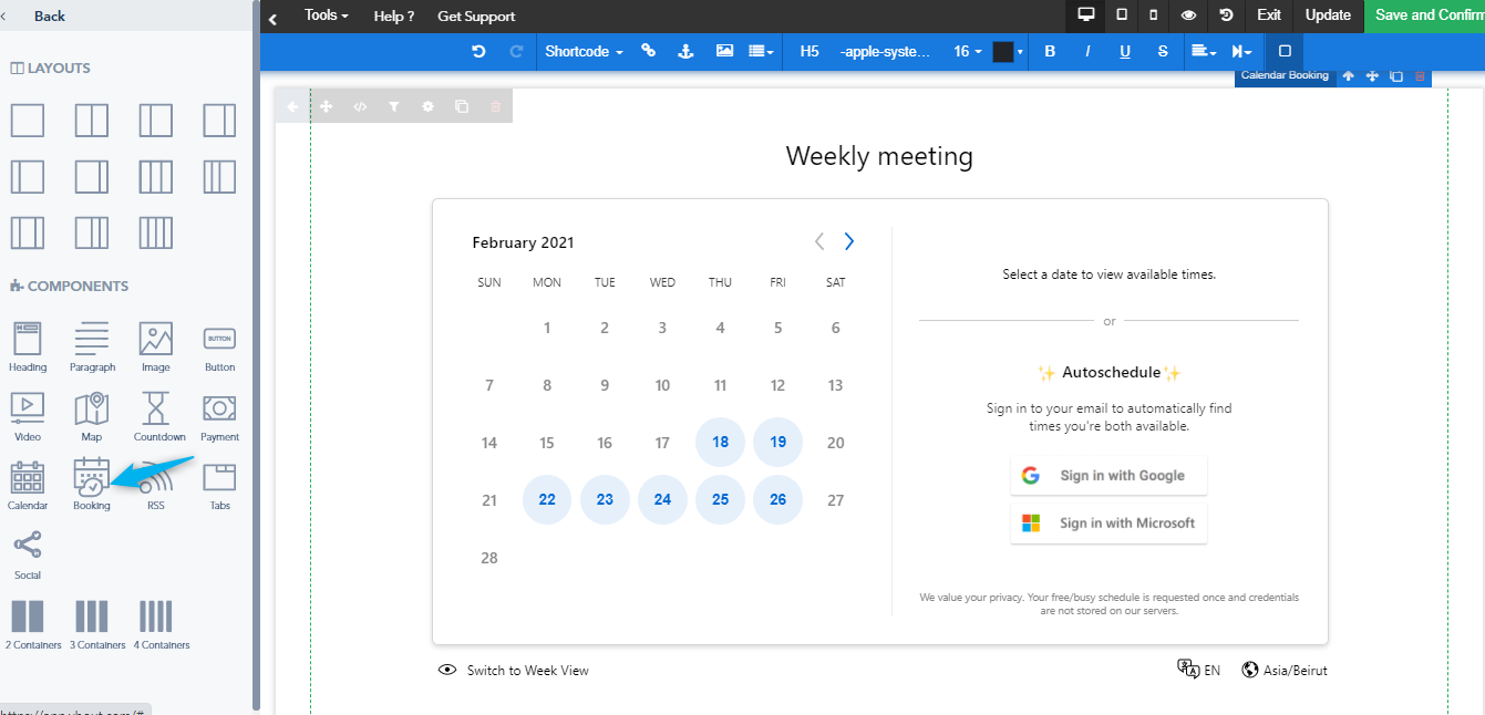 To add a previously created meeting calendar to your landing page, you can use the Booking component: