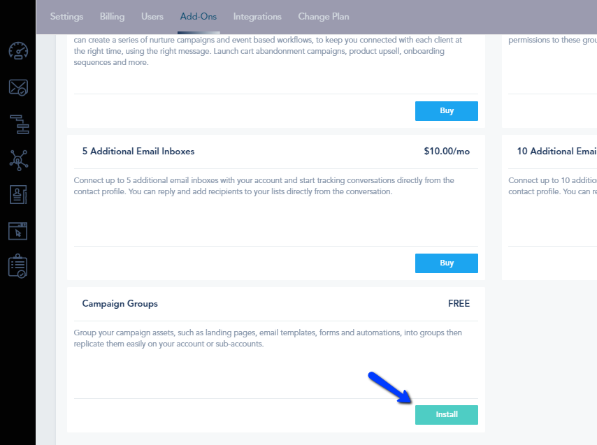 Go to Add-ons and Install the Campaign Group Add-ons: