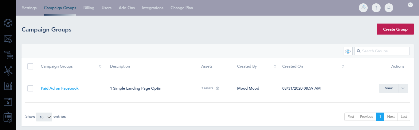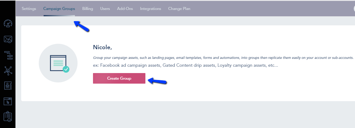 After installing the add-on, refresh your page and you will see the Campaign Groups here, click on Create Group: