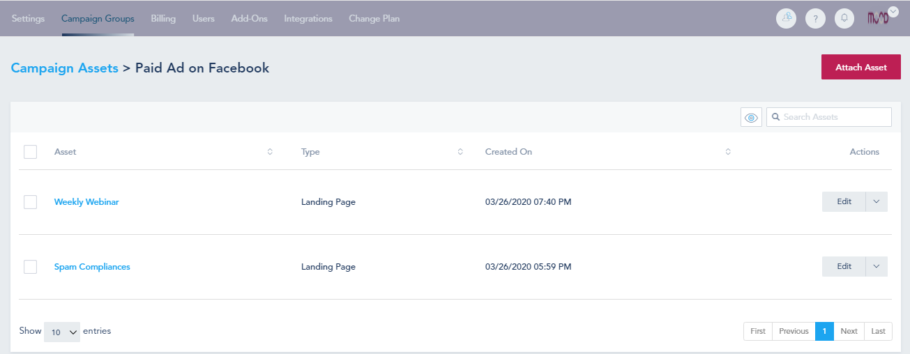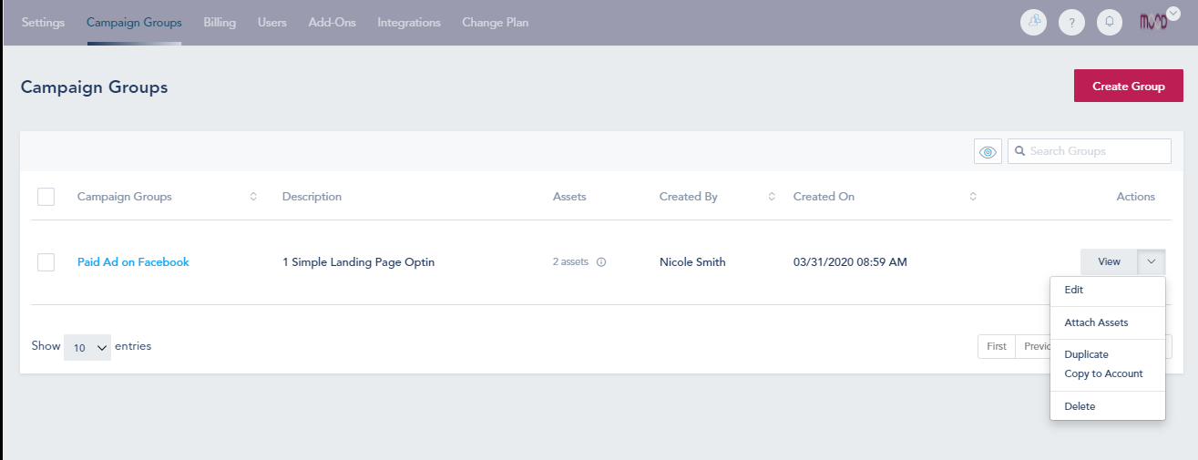 Once you finish, go back to Campaign Groups. You can choose from the dropdown menu to attach more assets, duplicate the campaign group or copy to account if you're an agency: