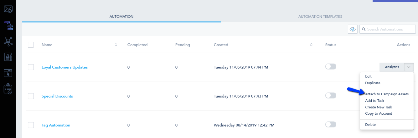 You can attach from an automation, list, landing page... an asset to the campaign assets