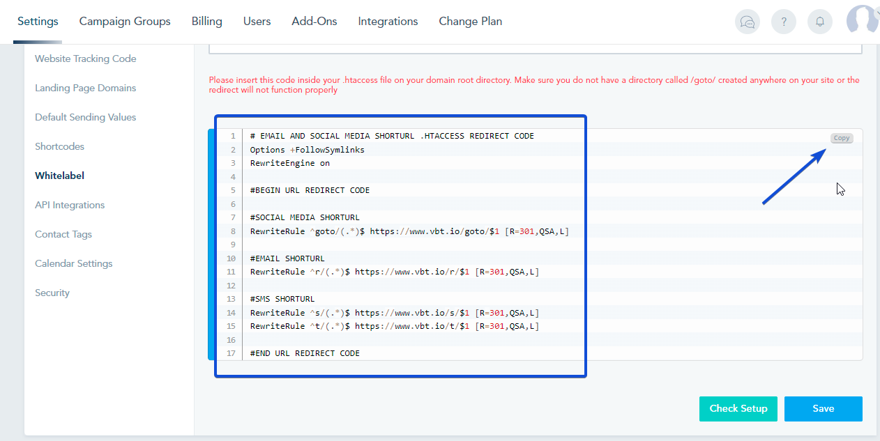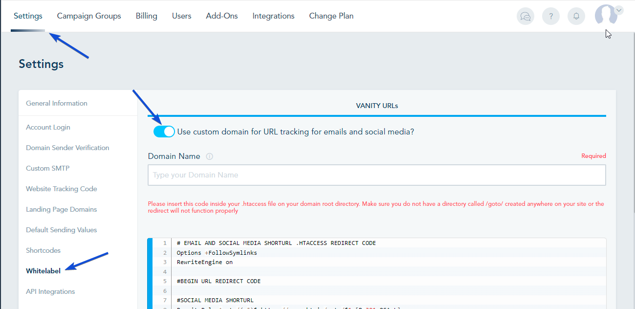 Activating Vanity URLs will allow you to use your own custom domain for tracking email and social media links. This way, when your contacts click on any link you send them via email or social media posts, they will see your custom domain.