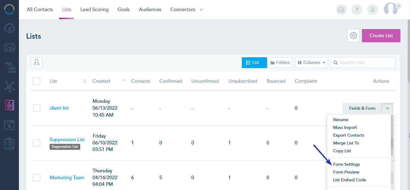 After you create your list, you can edit your list settings from the Drop-down menu next to the list, go to Form Settings.