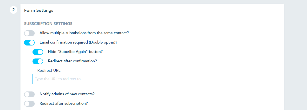 - Redirect After Subscription: Specify a URL to redirect contacts to a particular webpage after they successfully subscribe or submit a form. This can be a thank-you page or any other relevant destination.