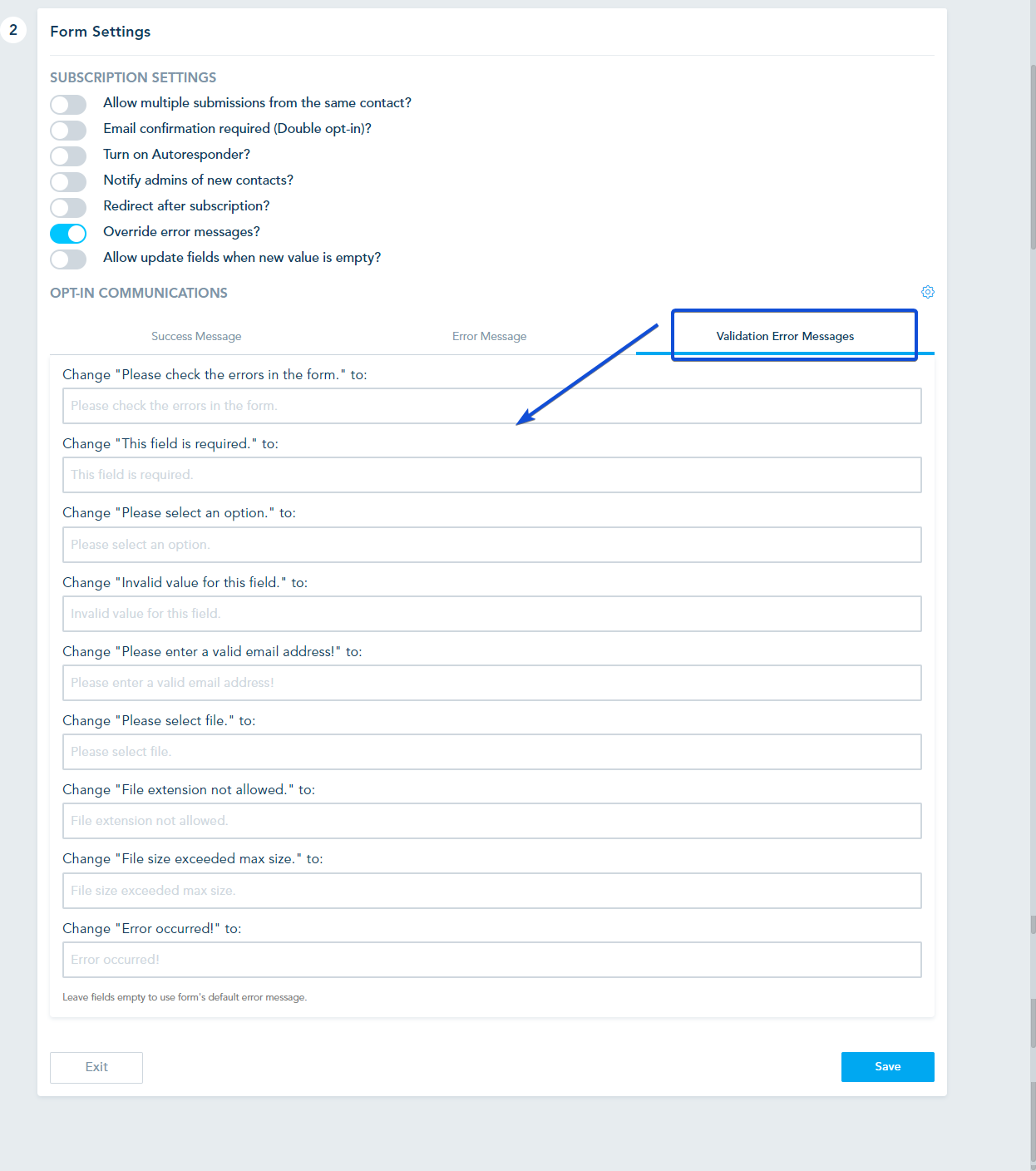 Enabling the Override error message option: you will have the option to edit all the possible error messages.