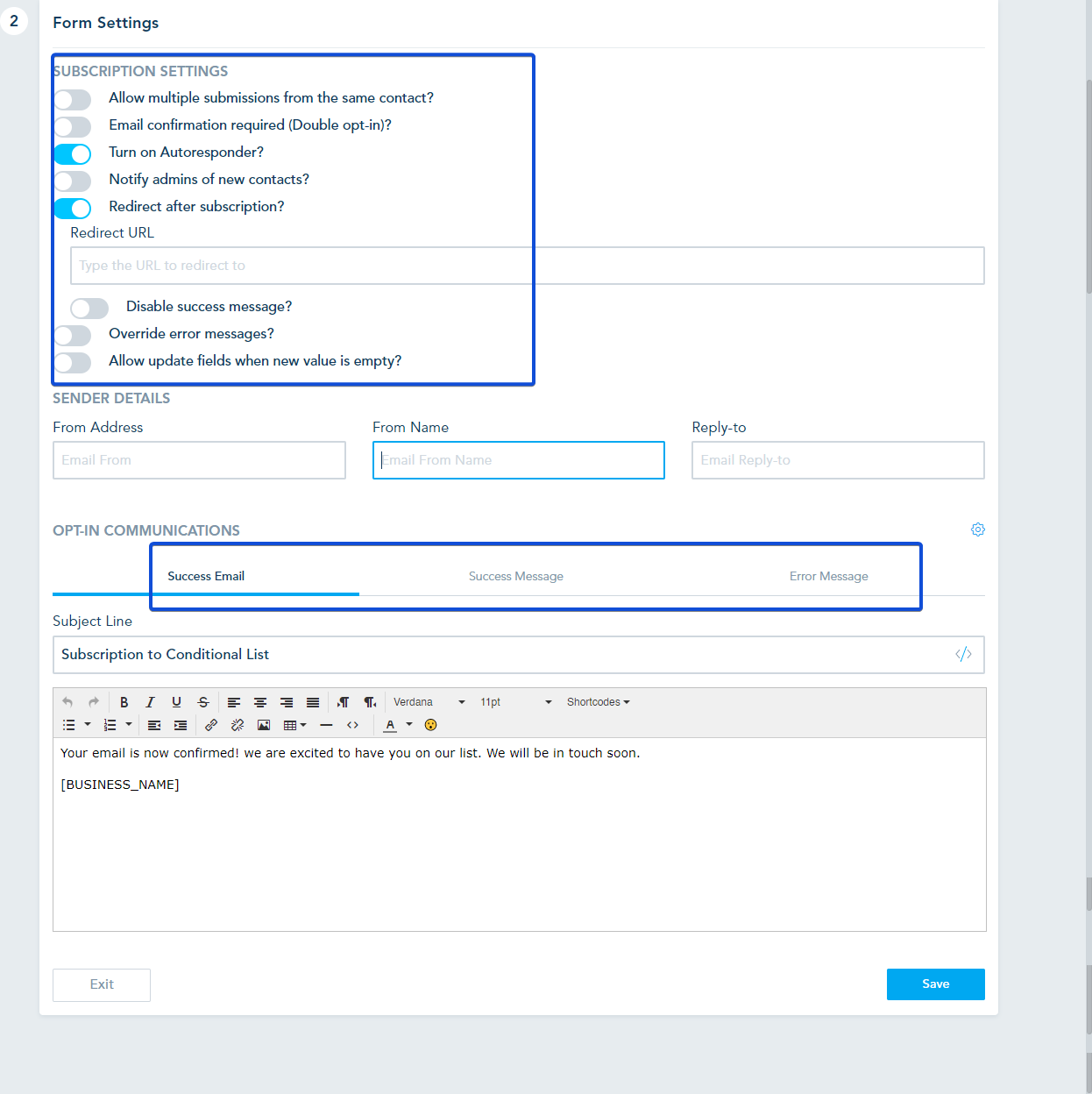 - Email Confirmation Required (Double Opt-In): Activate this setting to require contacts to confirm their email addresses by responding to a confirmation email. This adds an extra layer of verification to ensure the validity of the provided email addresses.