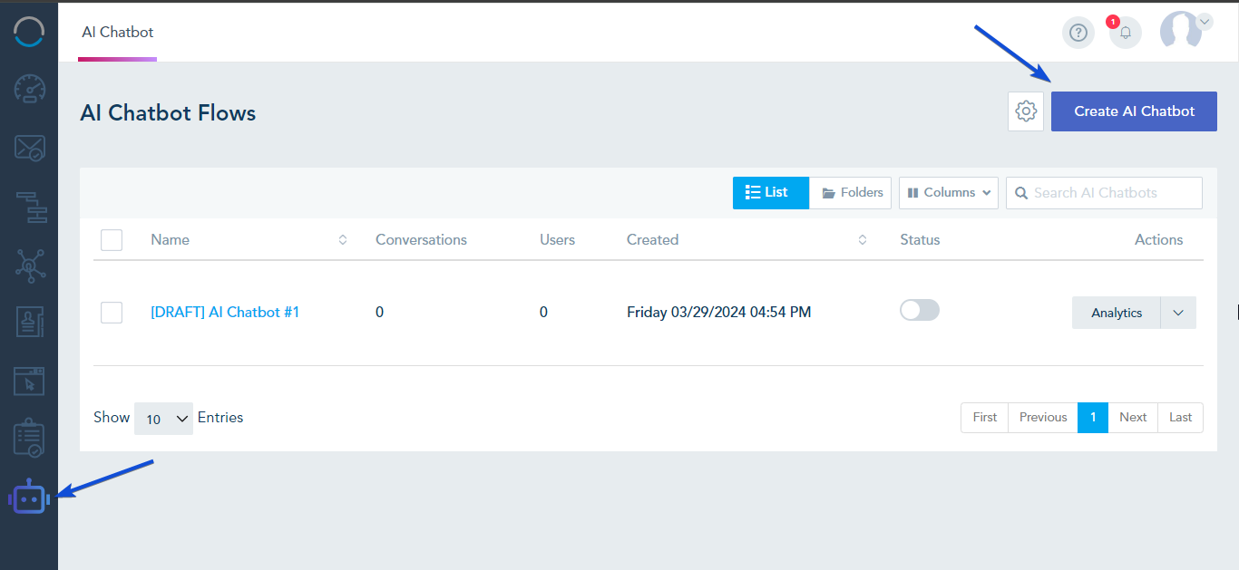 Go to the AI Chatbot tab, and click on Create AI Chatbot.